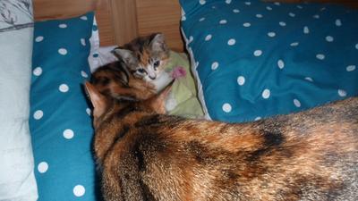 This is Belle checking on Summer, after all the hissing she did when she first saw her.
