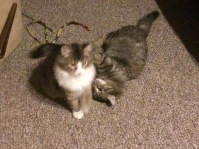 I play with them when I get home, usually more so before bedtime to TRY to tire the male out. My issue is that pretty much without fail, the male will meow and scratch on the carpet and my bedroom door around 2-3 a.m.! Some days we make it till 4 a.m., but those are pretty few.