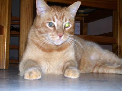 We adopted him as an eight week old kitten in October of 2003; thus he was named Pumpkin due to the orange hue and short fur type. This cat is certainly a charm and looks beautiful when playing in front of our home. Typically Pumpkin fills his days by snoozing on the bed, dining on the piano, and maintaining his territory outdoors.